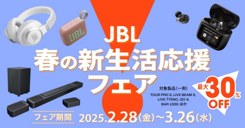 ​​​アメリカ カリフォルニア発祥の世界最大級のオーディオブランド「JBL」を擁するハーマンインターナショナル株式会社(本社:東京都千代田区、代表取締役:桑原拓磨)は、本日2025年2月28日(金)~3月26日(水)の期間限定で人気のワイヤレスイヤホンやポータブルスピーカー、サウンドバーを最大30%オフで購入できる「JBL春の新生活応援フェア」を開催いたします。
